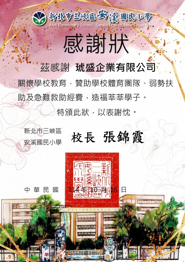 琥盛企業114年度公益捐贈-三峽安溪國小-贊助學校體育團隊、弱勢扶助及急難救助經費