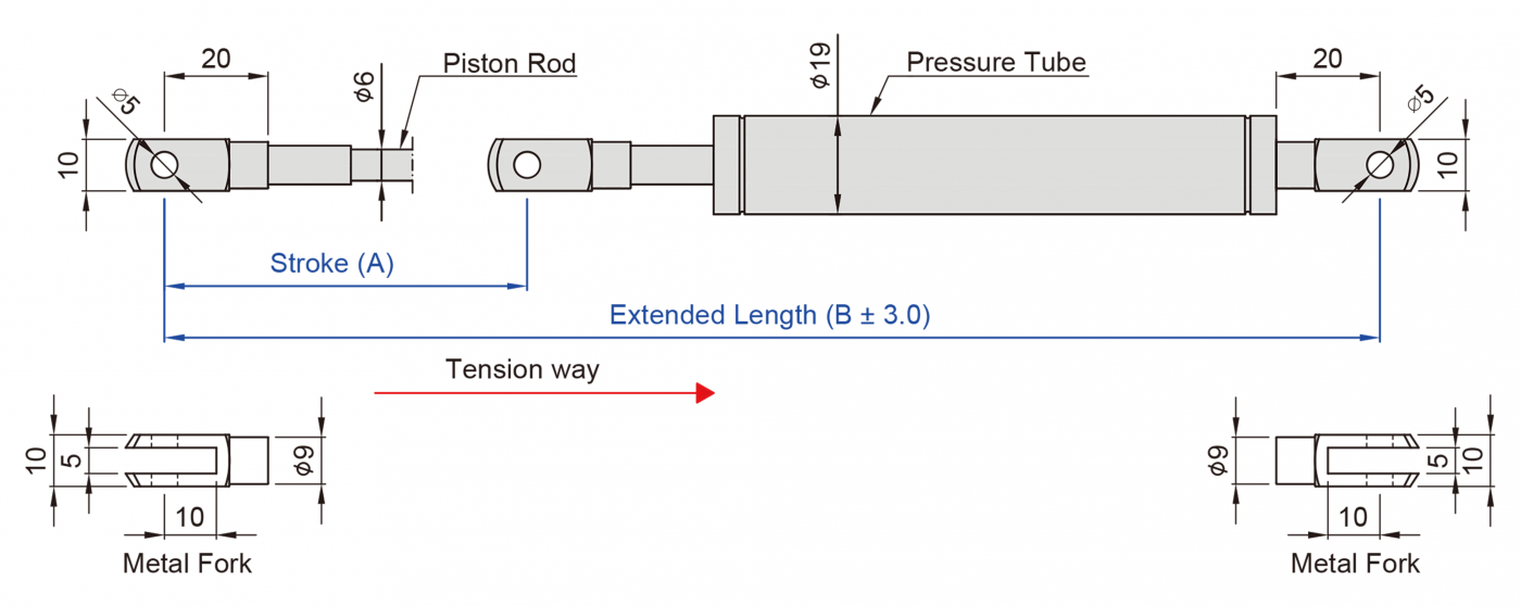 The special structure in the cylinder, the piston rod is pulled toward the inside through the gas pressure in the cylinder. When the tension gas spring does not have any load, the piston rod is always compressed.