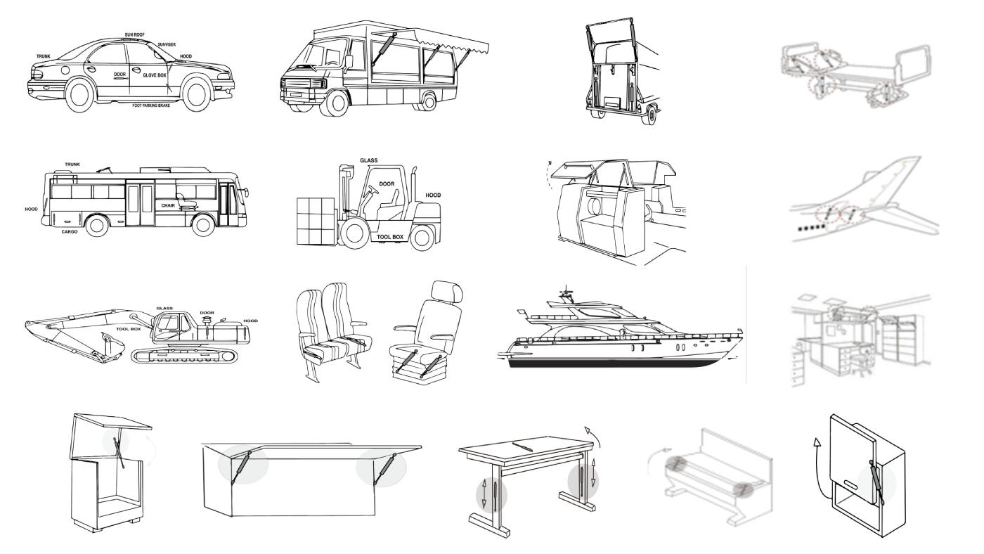 - 造船工業:遊艇內掀門,門窗支撐,機構掀蓋支撐及緩衝。