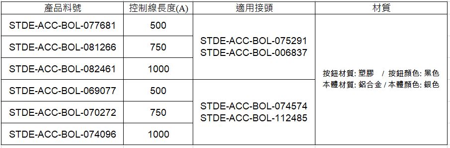1.下列三種料號之按紐控制器,需與定位型氮氣缸-開關接頭*搭配組合,形成一個完整的釋放系統。