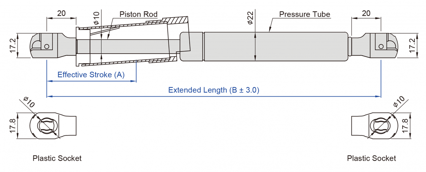1.SUPERSEN 自由型安全開關氮氣缸氣壓棒 1022 系列係指軸心直徑為10 mm, 外管直徑為22 mm 的氮氣缸並於活塞桿外部加裝套管扣環增加安全性,其壓力介質為氮氣(N2), 阻尼介質為液壓油(OIL),適用溫度為 - 20℃~+80℃,允許長度公差範圍為±2mm。