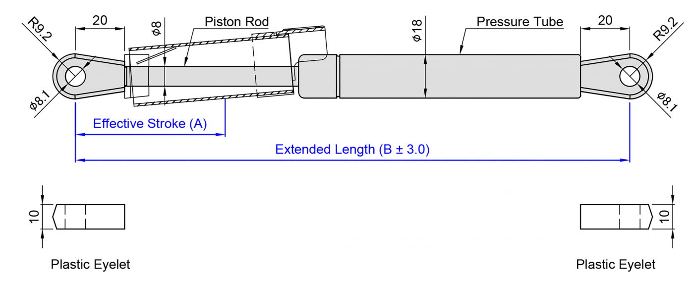 2.請客戶於詢價時,告知氮氣缸所需之壓力F1(N) , (9.8 牛頓(N)=1公斤(KG)=2.2磅(LBS) / 長度單位(mm)
