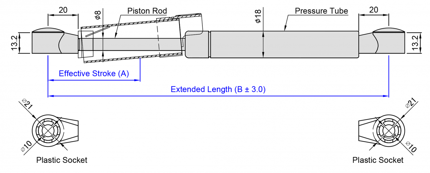 1.SUPERSEN 自由型不鏽鋼安全開關氮氣缸氣壓棒 0818 系列係指軸心直徑為8 mm, 外管直徑為18 mm 的氮氣缸並於活塞桿外部加裝套管扣環增加安全性,其壓力介質為氮氣(N2), 阻尼介質為液壓油(OIL),適用溫度為 - 20℃~+80℃,允許長度公差範圍為±2mm。